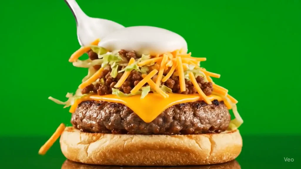 “description”: “A spoonful of seasoned ground beef, lettuce, and shredded cheddar cheese tumbles gracefully into a crispy taco shell, with a dollop of sour cream following. The background is a lively lime green.”