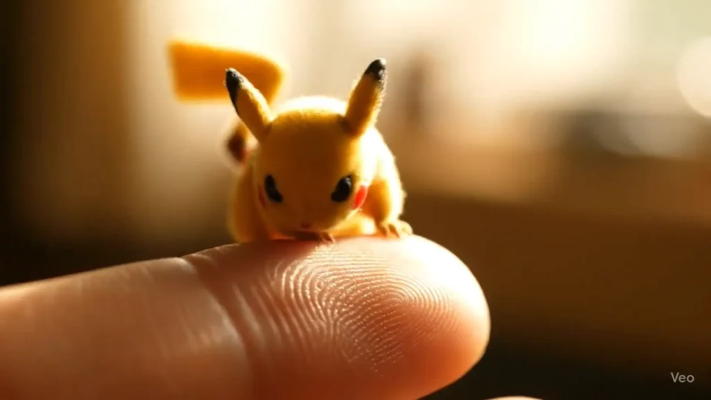 “description”: “A single, detailed Veo 3 prompt to generate an 8-second, high-detail macro video of the world’s tiniest Pikachu waking up on a fingertip.”,