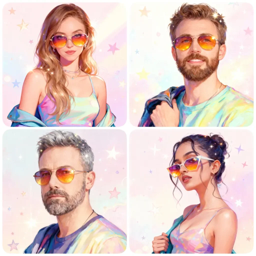 Tint the lenses with warm, glowing colors that amplify the dreamy feeling. Let the background dissolve into a smooth pastel gradient, filled with floating decorative shapes such as soft stars, sparkles, light flares, or gentle whimsical motifs.