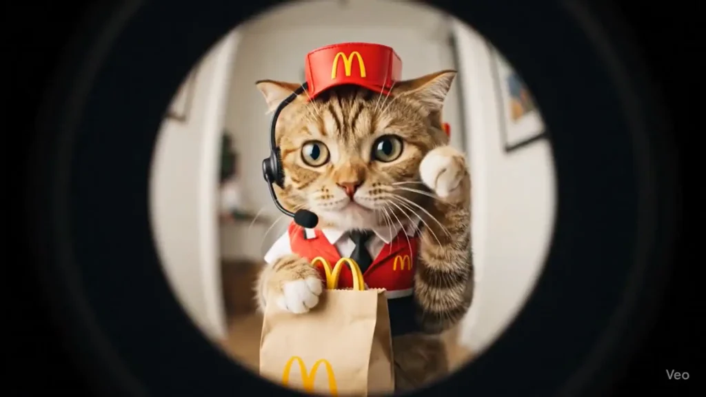 “video_description”: “An 8-second, highly emotive and photorealistic video of a friendly tabby cat working as a McDonald’s delivery driver, viewed through a door’s fisheye peephole. The cat is highly animated, displaying a charming variety of emotions from professional earnestness to hopeful friendliness and playful curiosity, bringing the character to life.”,