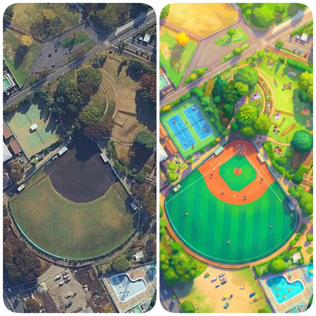 Transform this aerial map view into an illustrated aerial photograph captured from above. Create a vibrant, animated aesthetic with brilliant hues, and sprinkle miniature figures throughout the scene for a whimsical, illustrated, magazine-quality result.