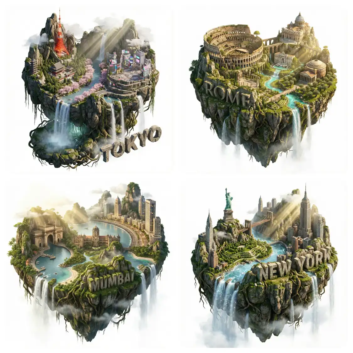 “instruction”: “Create a breathtaking isometric fantasy floating island representing {CITY_NAME} against a pure white background:”,