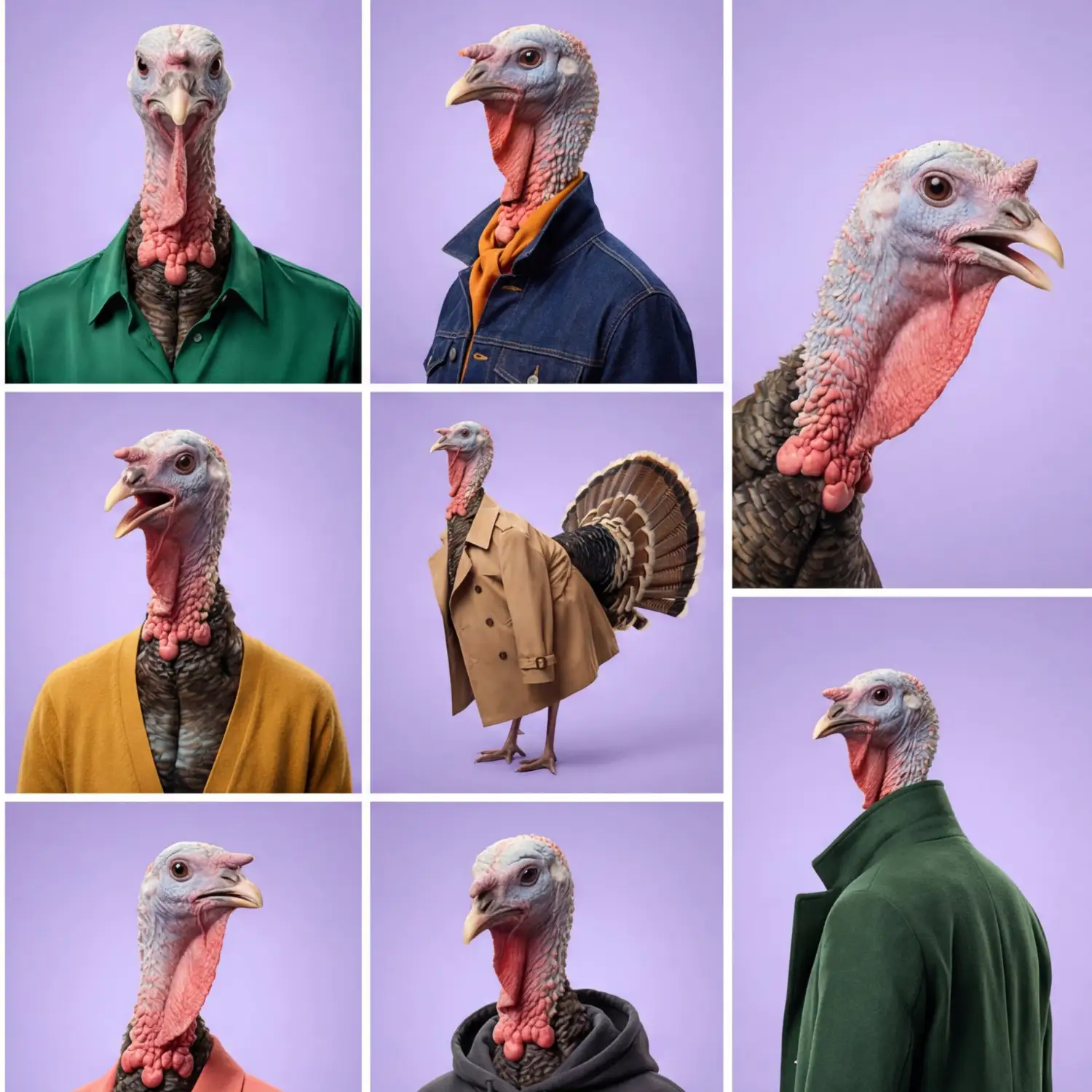 Ultra-detailed studio portrait of a sleek, well-groomed domestic turkey as the main subject, photographed in 8K resolution with dramatic softbox and rim lighting, arranged as 8 different shots in a single grid image.